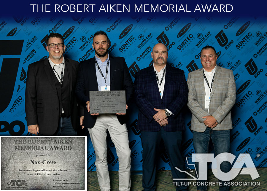We are excited to share a proud moment in our company’s journey. Nox-Crete was recently honored with the prestigious Robert Aiken Memorial Award at the Tilt-Up Concrete Association's 2024 Tilt-Up Convention & Expo. This recognition celebrates innovation, vision, and the relentless drive to push the boundaries of what’s possible in the tilt-up construction industry—and we couldn’t have achieved it without the unwavering support of our incredible team, dedicated customers, and valued distributors.