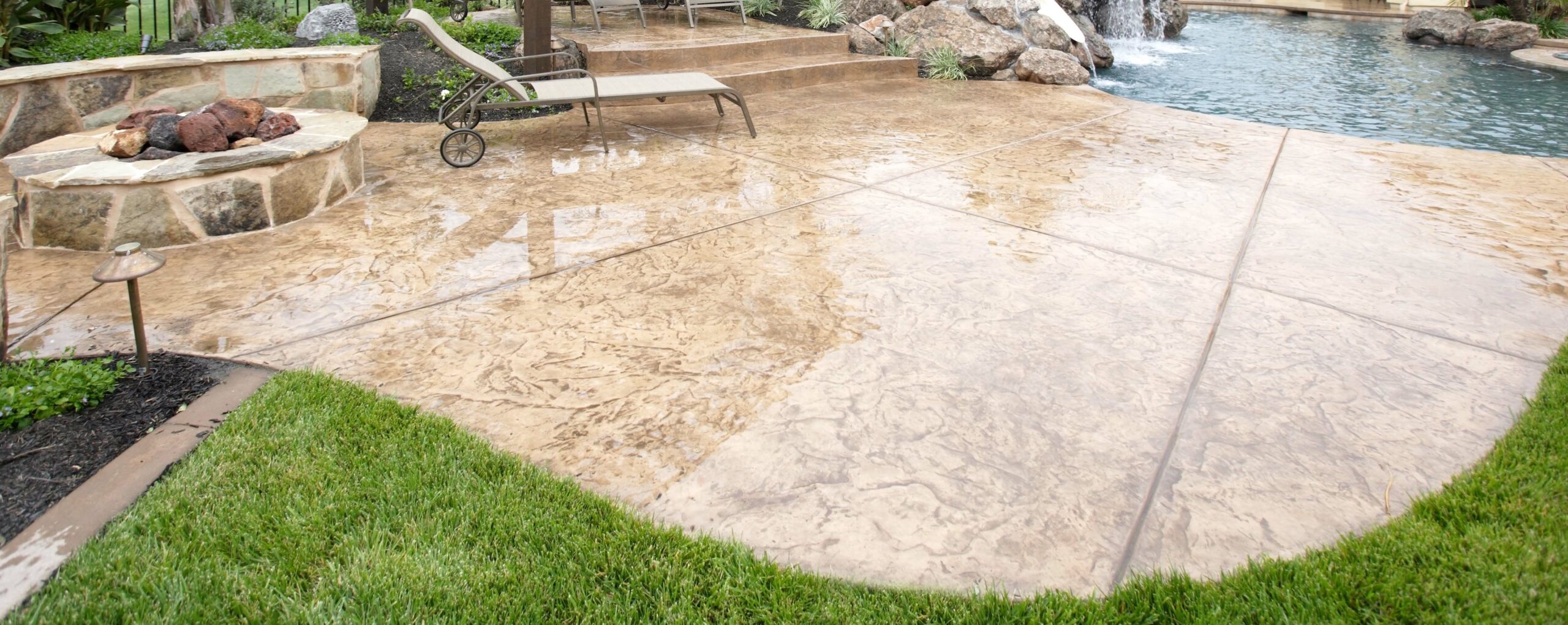 • Decorative stamped concrete areas around sensitive landscaping, sides of homes or pools that are susceptible to splatter damage
