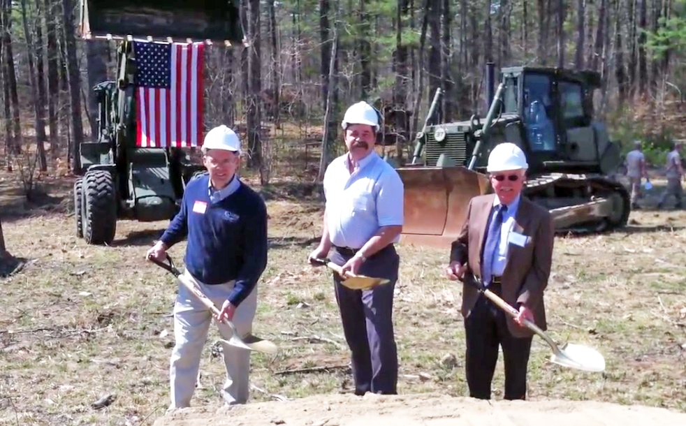 Alan Gould of A.H. Harris, left, thrives on partnerships. Here, joined by Jeffrey Spiller of Casco Bay Steel Structures, center and Peter Brissette, GM/Brand President of American Steel & Aluminum break ground on the dining hall at the Boy Scouts’ Camp William Hinds in Raymond, Maine. All parties involved, including A.H. Harris and Nox-Crete, donated material for the hall’s construction.