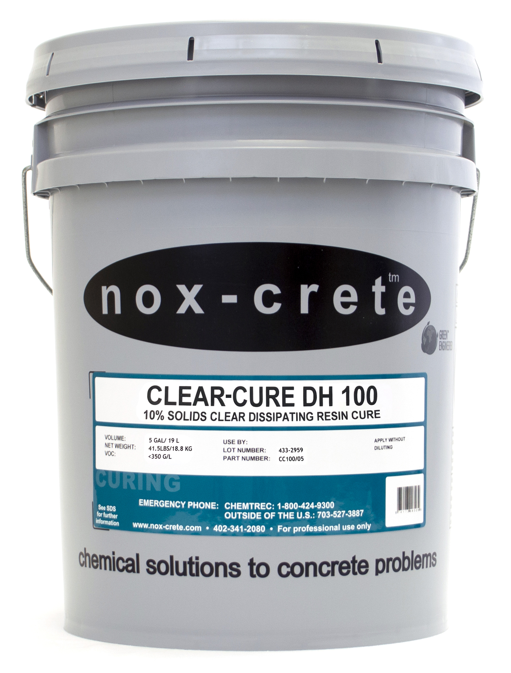 Clear-Cure DH horizontal concrete curing compound is Nox-Crete's new clear, water-based, dissipating hydrocarbon resin-type formula. Clear-Cure DH  offers high performance without waxes, paraffins, gums or oils. When applied to the surface of freshly place concrete, Clear-Cure DH rapidly forms a moisture vapor resistant membrane. It prevents the rapid evaporation of concrete mixing water, allowing concrete to properly cure and develop strength.