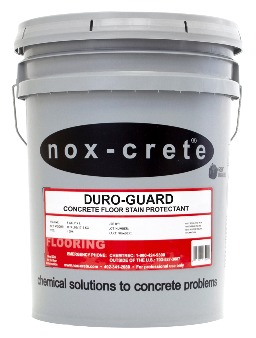 The small molecular size of the fluoroalkyl silane in Duro-Guard allows it to penetrate deeply into smooth troweled, burnished and polished concrete floor surfaces where it chemically reacts with siliceous containing compounds to form a hydrophobic (repels water and compounds dissolved in water) and oleophobic (repels oil and oil containing compounds) barrier that protects concrete floor surfaces from discoloration, staining and chemical attack. Duro-Guard is not a surface coating and will not alter the natural appearance or texture of treated concrete floor surfaces.