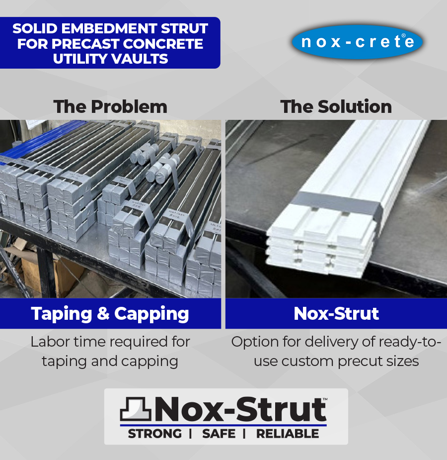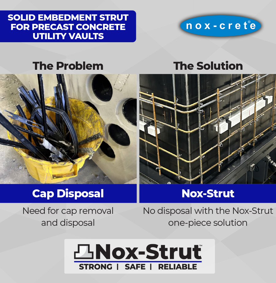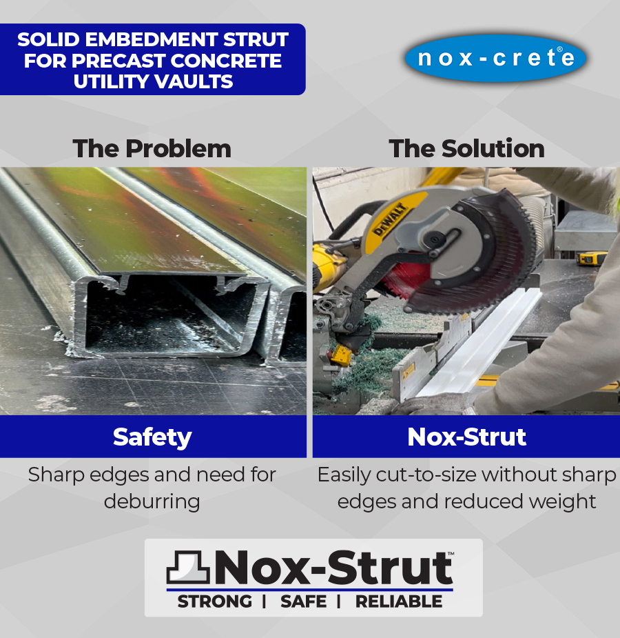 Nox-Strut™ is a new solid embed strut specifically designed for precast utility vaults, which are crucial for housing electrical and communication lines. These vaults serve as essential access points to underground utilities, ensuring efficient and safe maintenance and upgrades. Traditional channel systems used in utility vaults often present challenges and limitations, including cumbersome installation processes and structural weaknesses. Nox-Crete, an industry innovator, has developed the Nox-Strut™ as a simple yet effective solution to overcome these issues. Our advanced design not only simplifies the installation process but also enhances the overall durability and functionality of utility vaults.