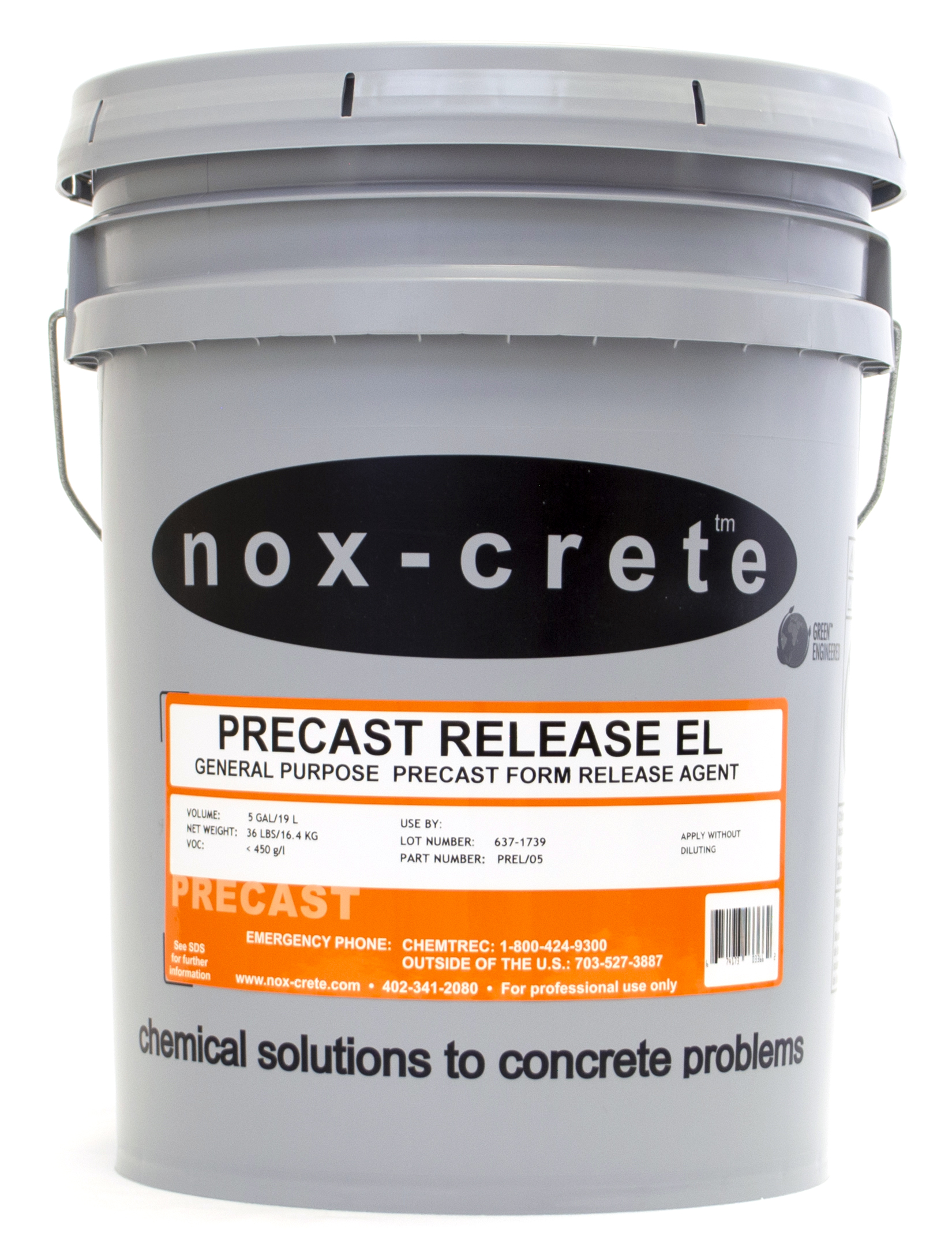 Standard form release agent, Precast Release EL contains a physical barrier component, as well as chemically active compounds that react with lime (calcium hydroxide) present in fresh concrete. The reaction yields a slippery soap film on the form surface in order to prevent concrete sticking and improve form stripping.