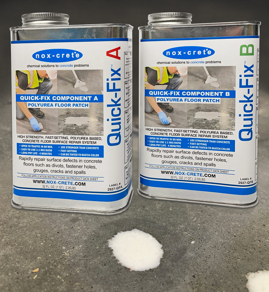 QUICK-FIX is a transparent, high-performance, polymeric concrete floor repair product designed to quickly and permanently repair/patch floor surface defects, divots, fastener holes, gouges, cracks and spalls. QUICK-FIX can also be mixed with silica sand, silica flour or fumed silica to repair joint nosing or deep floor surface damage. Can be tinted with Nox-Crete’s Neptune Gray Color Tint Pak, mixed with Portland cement, ground up concrete, organic dyes or shake-on color pigments to achieve improved color match to existing concrete floor surfaces. QUICK-FIX can be easily applied with a steel trowel, flat bladed squeegee or brush. Patched floor surfaces can be ground smooth with a sander, grinder or polisher to achieve nearly undetectable repairs.