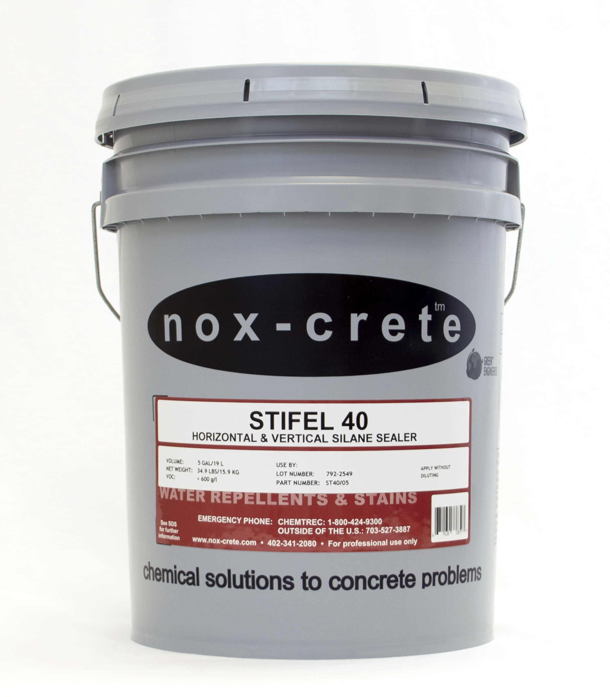 Solvent based silane sealer Stifel 40 is a transparent, breathable, ready-to-use formula that penetrates deep into concrete and masonry. Stifel 40 has a small molecular structure that allows it to move through concrete pores and penetrate deep, up to 1/2-inch or more. It chemically reacts with siliceous materials to form a hydrophobic barrier to prevent the absorption of water and waterborne chloride ions. In effect, users will experience a long-lasting water-repellent surface.